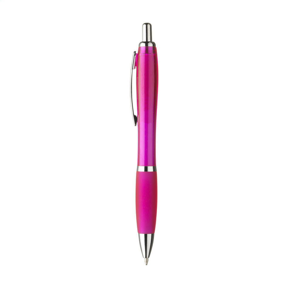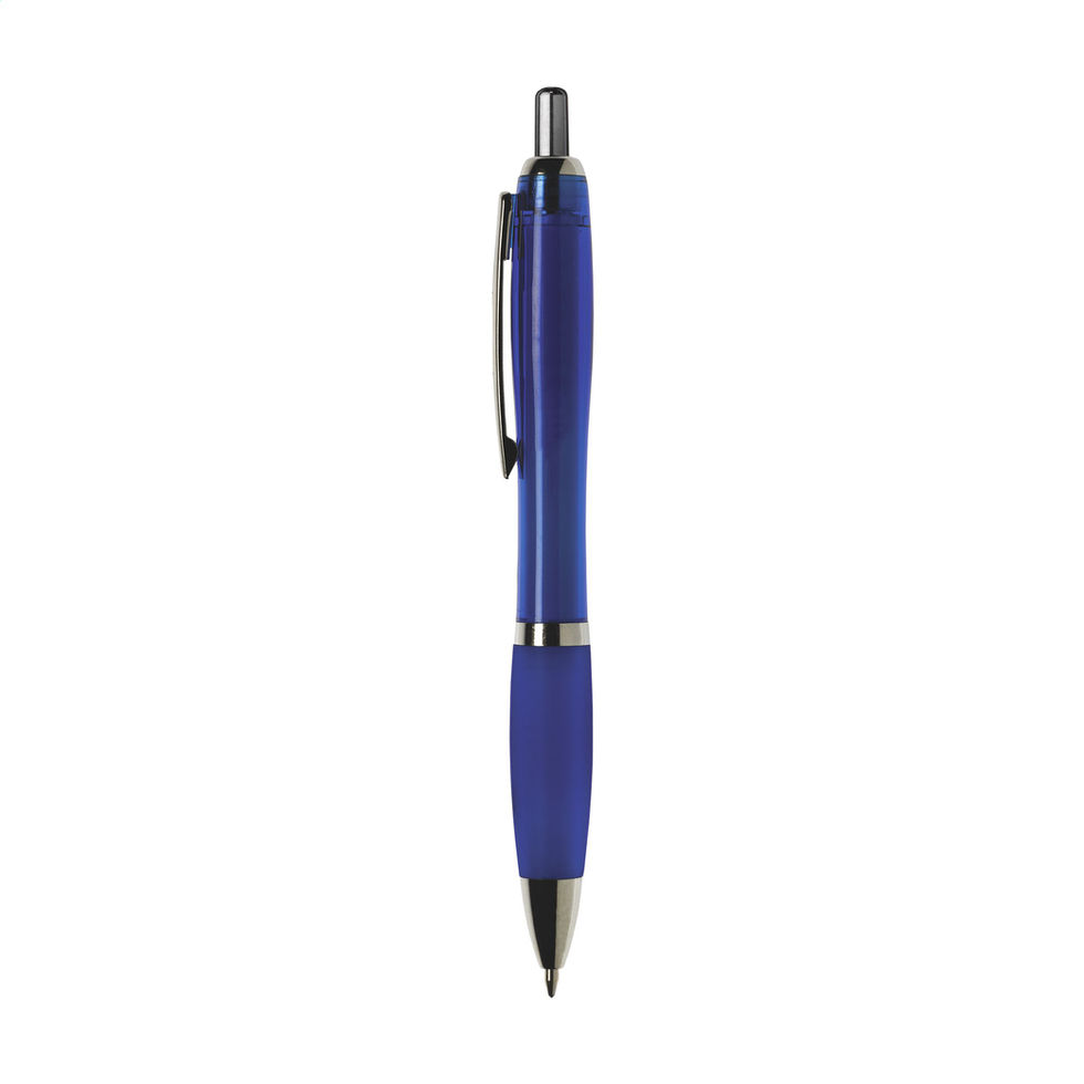 Blue or black ink ballpoint pen with transparant coloured barrel, non-slip grip and metal clip.