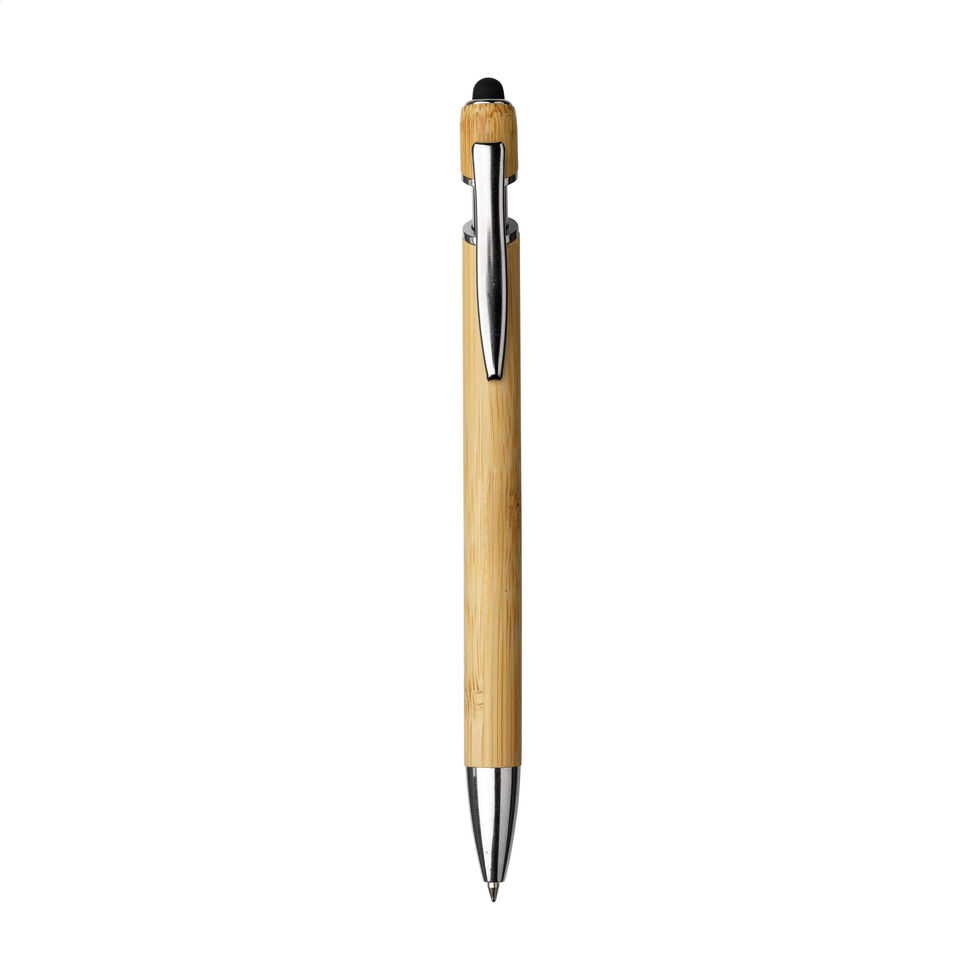WoW! Blue ink ballpoint pen with a beautiful, FSC 100% certified bamboo barrel. With a rubber top/pointer to operate touch screens. With a striking metal clip and a plastic point.