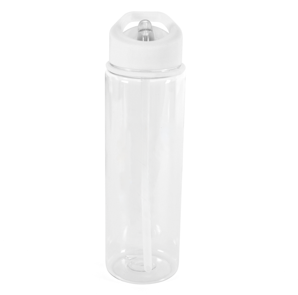 725ml single walled transparent PET plastic drinks bottle with clear straw, fold down sipper and coloured screw top lid. PP plastic lid, AS plastic sipper and PE plastic straw. BPA & PVC free. Available in 10 colours.